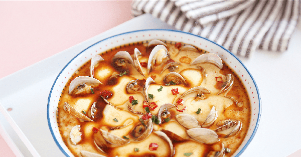 3.等到花蛤湯凉後,倒入蛋液中,攪拌均勻。依次放入花蛤擺好。