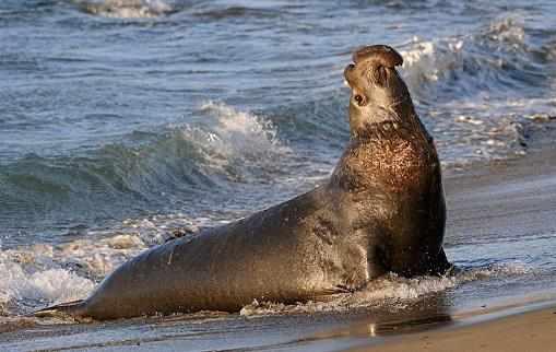 北方象海豹(Mirounga angustirostris)是棲息在東北太平洋海域的巨獸。它們主要在加拿大、美國和墨西哥西海岸的偏僻島嶼上繁殖和育幼。這種海豹表現出顯著的“性二型”,也就是雄性和雌性的外貌差別很大。成年雄性象海豹的體長可達5米,體重近3噸,臉上還長著30釐米的臃腫大鼻子。雌性的體型則較小,體長不足3米,體重不足1噸,而且鼻子很小,貌不驚人。從這個角度上看,長鼻子是雄性象海豹的第二性征。只不過,這個大鼻子也不是與生俱來的。大概3歲左右雄性的鼻子才會開始發育長大。