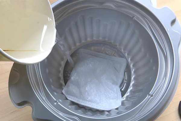 3、將發熱包放進大的塑料鍋的底部,然後往鍋中倒入冷水,水要剛剛好沒過發熱包。