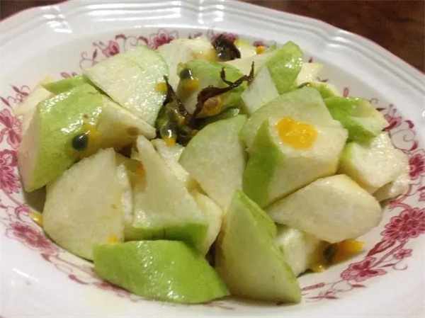 3、芭樂還可以用來做沙拉,將芭樂切成小塊和其他一些水果攪拌均勻,再加入一些沙拉醬就可以食用瞭。