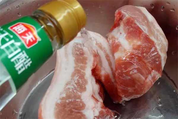 2、在凍肉上倒一點醋也可以起到解凍肉類的作用,醋可以降低冰點,可以加快解凍的時間,還可以讓肉質更鮮嫩,解凍完再將醋沖掉就好瞭。