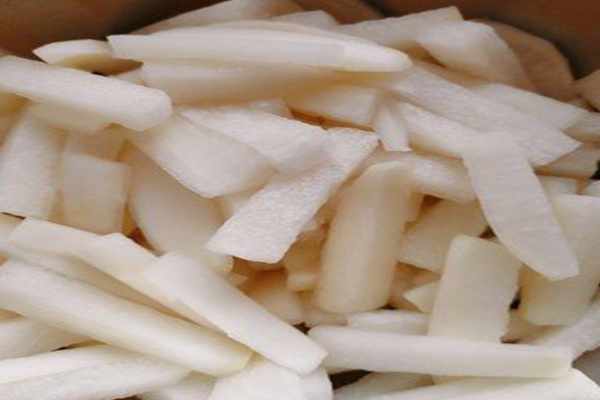 3、醃制好的蘿卜片用純凈水進行沖洗,並把蘿卜片上面的水分擠幹後備用。