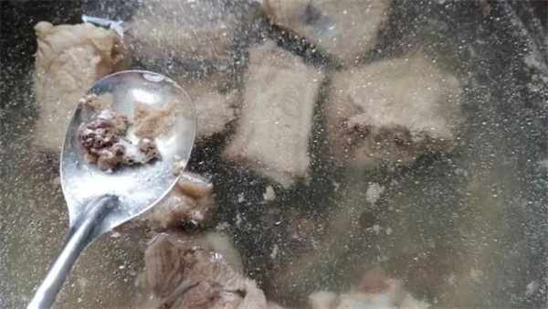 3、大火煮開後,湯表面會出現一些浮沫,用勺子將浮沫撈出來,之後換成小火燉一個小時,一小時後加入鹽再燉20分鐘就好瞭。