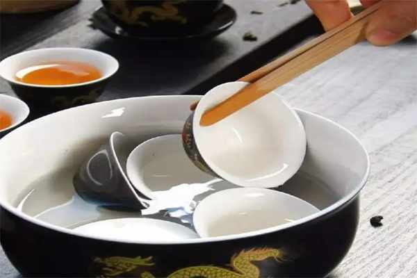 3、洗茶:取來100度的沸水,把沸水沿著碗的邊沿慢慢註入碗裡,倒入7分滿就可以瞭,等待5秒左右,就可以倒掉茶水。