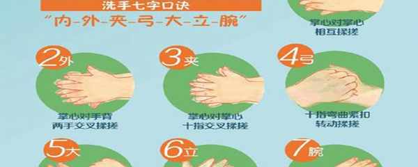 餐前便後外出回傢洗手的七字口訣:內、外、夾、弓、大、立、腕。七字口訣對應的是洗手掌、洗背側指縫、洗掌側指縫、洗指背、洗拇指、洗指尖、洗手腕和手臂。