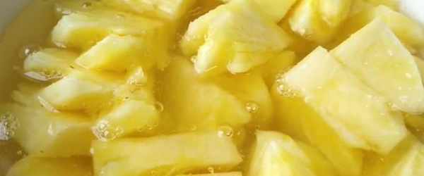 4、或者,將已經切好的菠蘿放進小蘇打裡面,經過小蘇打水的浸泡,菠蘿上的蛋白酶就會被消滅掉,吃起來就比較香甜,不再有澀味。