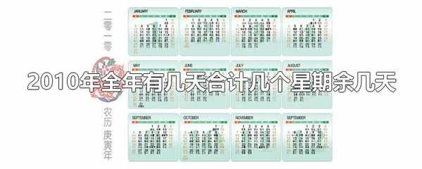 2010年全年有365天,合計52個星期餘1天。平年全年有365天,閏年全年有366天,因2010年是平年,故全年有365天,一個星期有7天,用365除以7,商和餘數便是有幾個星期和餘幾天。
