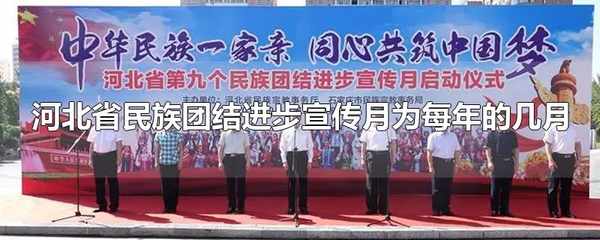 河北省民族團結進步宣傳月為每年的9月。河北省自古以來就是一個多民族省份,各個民族在這裡生生不息、源遠流長,每年9月份,河北省都會開展民族團結活動進步宣傳月,舉行相關系列活動。