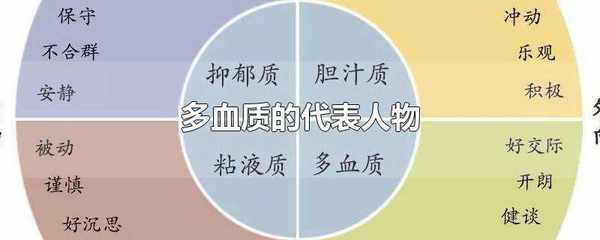 多血質的代表人物是王熙鳳、賈寶玉、孫悟空。多血質的性格特點是熱愛交際、能說會道、活潑好動,善於表達自己的情感,思維比較活躍,對環境適應性比較強,並且具有較強的動手能力和語言表達能力。