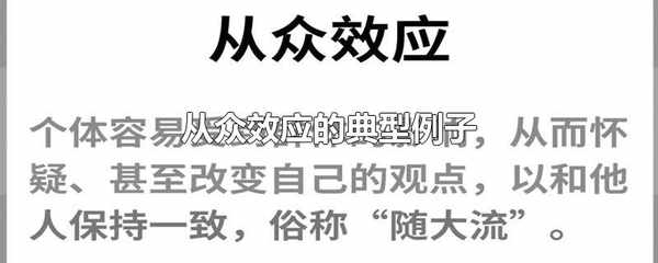 從眾效應也稱為樂隊花車效應、“隨大流”,表現形式有口服心服、口服心不服、完全隨大流三種。
