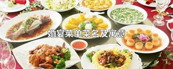 婚宴菜單菜名及寓意如下:迎賓八彩蝶——喜慶滿堂、大紅乳豬拼盤——鴻運當頭、魚香焗龍蝦——濃情蜜意、彩椒炒花枝仁——金枝玉葉、雪蛤燴魚翅——大展宏圖、蠔皇扒鮑貝——金玉滿船、花菇扒時蔬——花好月圓等。