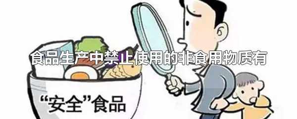 食品生產中禁止使用的非食用物質有吊白塊、蘇丹紅、王金黃、三聚氰胺、硼酸、硼砂、硫氰酸鈉、玫瑰紅B、美術綠、堿性嫩黃、工業用甲醛、工業用火堿、一氧化碳、硫化鈉、工業硫磺、工業染料等。