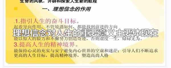 理想信念對人生的重要意義主要體現在:理想信念指引奮鬥目標、理想信念提供前進動力 、理想信念提高精神境界。理想信念對人生歷程起著導向的作用,指引人生的奮鬥目標。