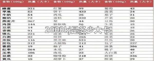 2000kj相當於478大卡。1kj=0.239kcal,通常所說的的大卡及即千卡(kcal),故2000kj相當於478大卡,其換算關系是1000j=1kj,1000cal=1kcal,1kcal=4.184kj。
