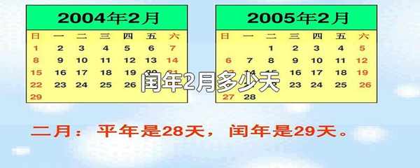 閏年2月共有29天。地球圍繞太陽一圈需要365天5小時48分46秒(合365.24219天),而我們公歷上把一年定為365天,所餘下的時間約為四年累計一天加在二月裡,所以平常年份每年365天,二月為28天,而閏年為366天,二月為29天。
