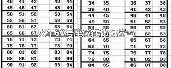 火車60號座位大約位於火車車廂中部位置,火車車廂一般分為定員118人和112人兩種,如果是前者,60號座位一般位於三人座靠窗位置,如果是後者,60號座位一般位於兩人座靠過道位置。