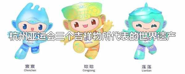 杭州亞運會三個機器人造型的吉祥物:琮琮代表世界遺產良渚古城遺址,名字源於該遺址出土的代表性文物玉琮。蓮蓮代表世界遺產西湖,名字源於西湖中無窮碧色的接天蓮葉。宸宸代表世界遺產京杭大運河,名字源於該運河杭州段的標志性建築拱宸橋。