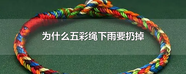 因為下雨時將五彩繩扔到雨水裡飄走,寓意遠離邪惡、煩惱、疾病、憂愁。人們將五彩繩扔掉,實際上是對美好生活的期望。五彩繩顏色是青、白、紅、黑、黃,分別代表木、金、火、水、土。