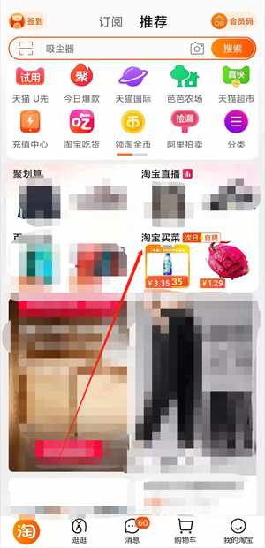 1、打開手機淘寶,點擊頁面上方的“淘寶買菜”。