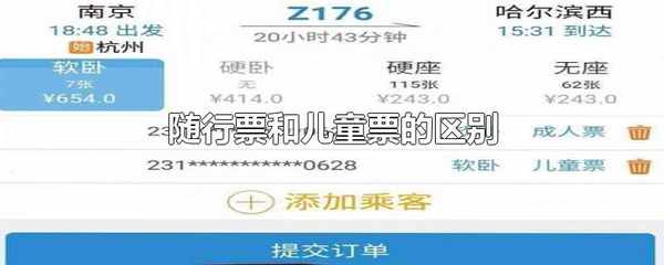 隨行票全稱隨行兒童票,與兒童票的區別隻是名稱不一樣,性質上都是兒童票。隨行兒童票指的是一名成人旅客攜帶一名兒童一起乘車時需要購買的兒童票。