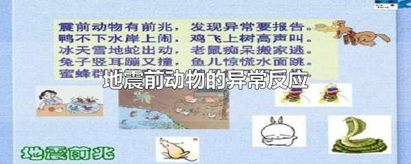 雞、鴨和鵝都異常驚慌,不吃食,雞試圖跳得更高。豬、牛、羊等牲畜不想進窩,情緒激動。貓、狗狂叫不安,貓急於往樹上跑,狗刨地。魚成群漂浮、狂遊、跳出水面,缸養的魚亂跳、頭尾碰出血、跳出缸外。