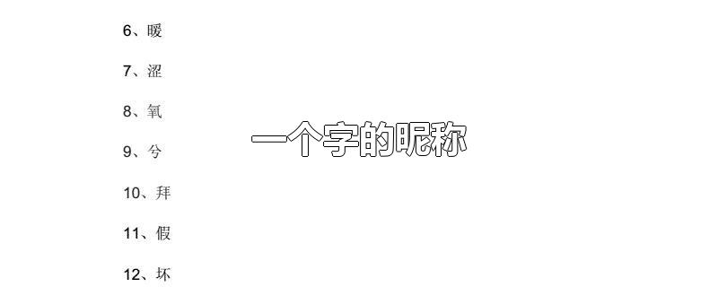 一個字的昵稱有巷、夢、伊、浮、怣、倦、默、涼、阡、遇、肆、櫻、沫、瑾、蠱、陌、煙、傀、憩、箏、悸、悴、淼、念、苒、獨、雪、惜、膩、汐、卿、封、離、青、瞳、苡、惢、眠、暖、荒、囍。