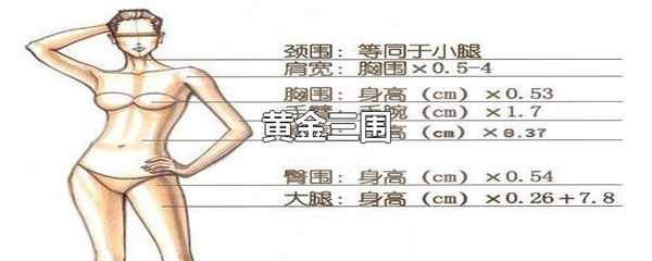 黃金身材三圍尺寸分別是胸圍84厘米、腰圍61厘米、臀圍90厘米。標準身材取決於胸部、腰部、臀部的比例以及高度。以身體中心畫一條直線,分別以胸部和臀部為頂點造出兩個三角形,三角形前後和上下的比例都均等,交叉點正好位於腰部則可稱為理想的體形。