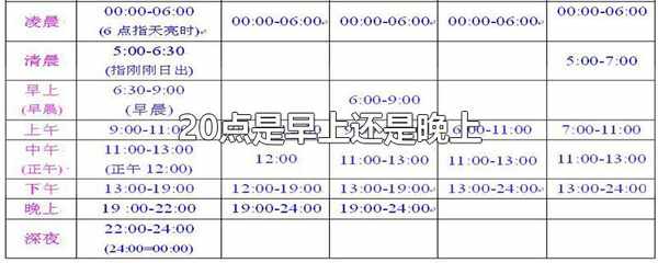 20點是晚上。20點是晚上8點,20點采用的是24小時計時法。早上也稱早晨、晨、朝,指日出至日出後兩小時的時刻,與上午、中午、下午、晚上、凌晨、清晨合組成一天。