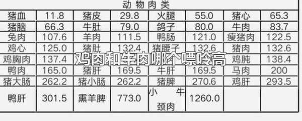 雞肉和牛肉中,雞肉的嘌呤比較高。每100克雞肉中嘌呤含量為140毫克左右,每100克牛肉中嘌呤含量大約為83毫克。通常將每100克食物中的嘌呤含量超過150毫克視為高嘌呤食物。