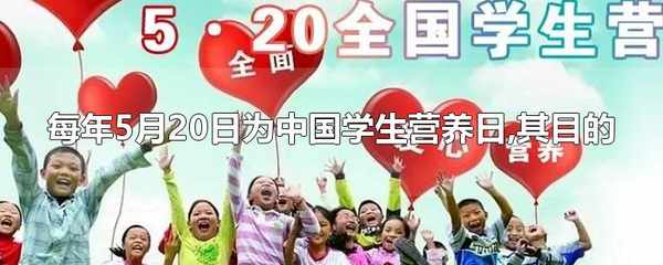 每年5月20日為中國學生營養日,其目的在於廣泛、深入宣傳學生時期營養的重要性,大力普及營養知識。營養狀況和營養成分的優劣是影響一個民族人口素質的重要因素,它直接關系到青少年體能與智能的發育狀況。
