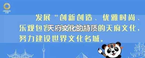 天府文化的特質為:思想開明、生活樂觀、悠長厚重、獨具魅力。成都平原被譽為“天府之國”,是古蜀文明重要發祥地,孕育積淀出思想開明、生活樂觀、悠長厚重、獨具魅力的天府文化特質。