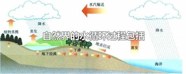 自然界的水循環過程包括海上內循環、陸上內循環以及海陸間循環。水循環是指地球上不同地方的水,由於經過太陽高溫而蒸發到大氣層後,通過降雨等方式轉移到另一個地方的循環過程。