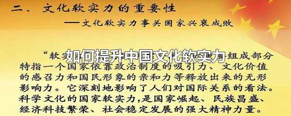 文化軟實力是指一個國傢或地區文化的影響力、凝聚力和感召力,是國傢軟實力的核心因素。