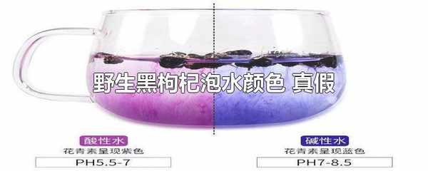 野生黑枸杞中含有花青素,遇酸性水呈藍色,遇堿性水呈紫色,而染色野生黑枸杞一般隻能沖泡出一種顏色。因為用其他類似的果實染色後冒充野生黑枸杞,而染色野生黑枸杞沖泡後可辨別。