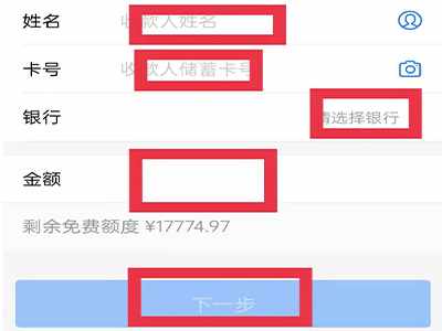 4、在轉到銀行卡頁面填寫對公賬戶姓名、卡號等信息,點擊“下一步”。