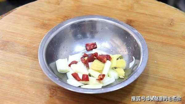 1.准备食材:老豆腐200克,切成方形的块,放在盘中备用。大葱一段从中间破开,切成葱花。大蒜切成蒜片,生姜切成姜片,再抓入干辣椒1克。
