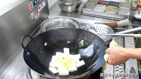 2.食材准备好后,我们先把豆腐煎一下,锅内烧油,充分滑锅后倒出热油,倒入凉油,热锅凉油是为了防止豆腐粘锅,倒入豆腐以后,晃动炒锅,并撒入食盐2克,加入食盐给豆腐入味的同时也能防止豆腐粘锅。