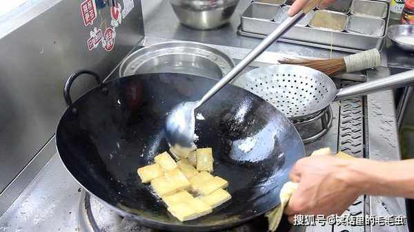 3.不停地晃动炒锅,豆腐的一面煎黄以后,翻过来煎另一面,等到豆腐的两面都煎成金黄色,小火煎制大概两分钟左右,倒出豆腐控油备用。