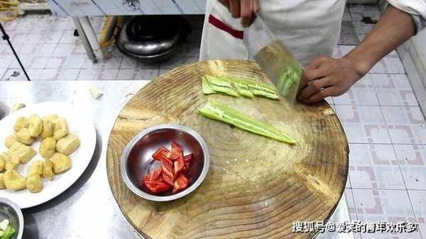 3.红椒半个,斜切成片,青椒一个,去籽后,也切成片,青椒红椒主要用来配色。