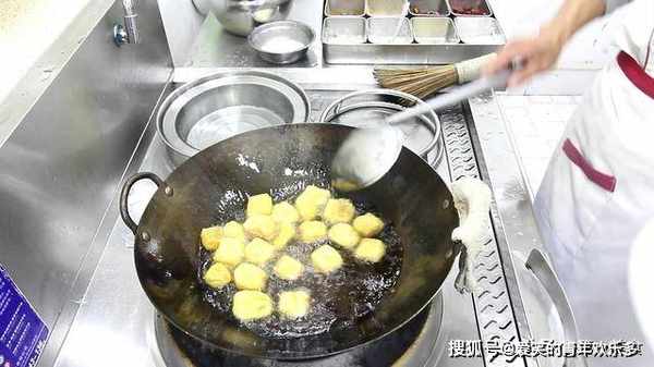 4.锅内烧油,把油烧至6成热,倒入豆腐泡过油炸一下,开中火炸20秒钟,把豆腐泡炸至表皮变硬,即可倒出控油。