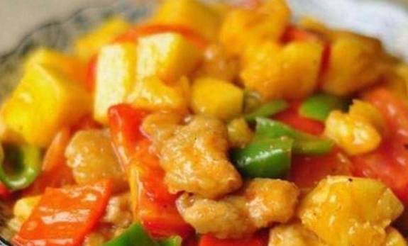 4、锅里留少许底油,加入青红椒块翻炒至断生,倒入炸过的脊肉片和菠萝丁翻炒几下,淋上适量芡汁翻炒至汤汁粘稠后即可出锅。