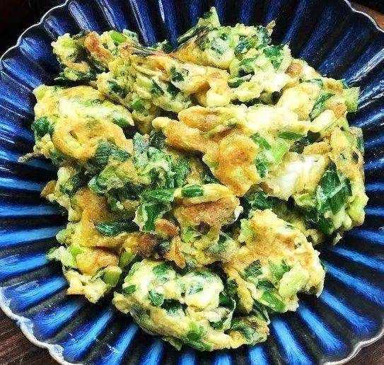 原料:韭菜适量、鸡蛋4个、油适量、盐适量、五香粉适量。
