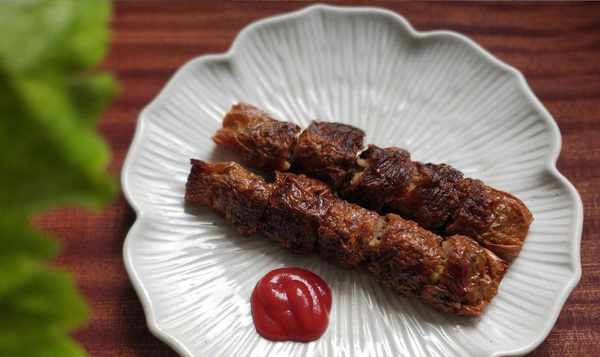制作方法:前肢肉剁碎,荸荠,葱,小葱(前肢肉可以切大块,我用刀剁的),生抽,蚝油,调味五香粉,鸡蛋一个,加甜土豆粉,拌匀;剥薄豆壳,像春卷一样卷起肉馅