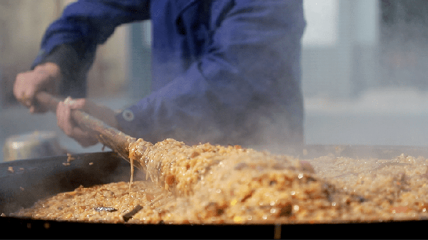 点火、起锅、烧油,放入大料炒香后捞出,放入葱、姜、蒜和事先切好的猪肉爆炒,再放入洗净切好的各种蔬菜。此时另一口大锅水已经烧开了,几个人相互配合,把淘过的大米放入锅中,待米七八分熟时,把炒好的菜放入米饭中搅拌均匀,少时后抽火慢炖。