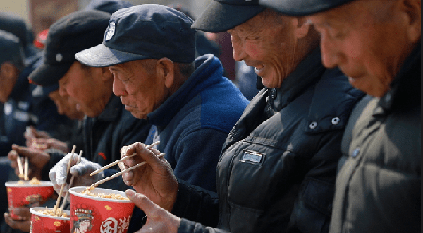 经过层层工序,两大锅香喷喷的咸米饭就焖好了。村民们依次排队盛好饭端上桌子,乡里乡亲围坐在一起,谈天说地,其乐融融。