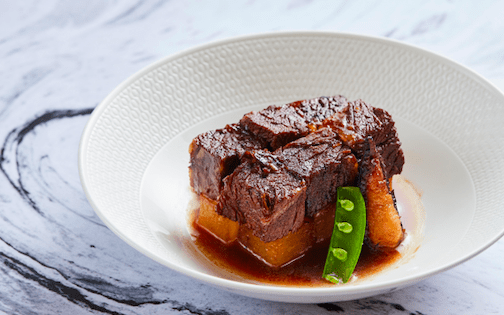 如果喜欢中式的甜蜜氛围,不妨试试凰庭主厨施晨荣限定推出的八道式精美浪漫节日菜单,包括羊肚菌慢炖谷饲牛、脆皮玻璃乳鸽、XO酱葱油手工面等。特别推荐羊肚菌慢炖谷饲牛,是主厨在经典粤菜中加入江南菜系食材的大胆创新。和牛肉搭配酿入虾胶的羊肚菌,运用传统粤菜中慢炖的烹饪技艺,保留和牛肉与羊肚菌的浓郁醇香,巧妙加入虾胶,鲜味十足。