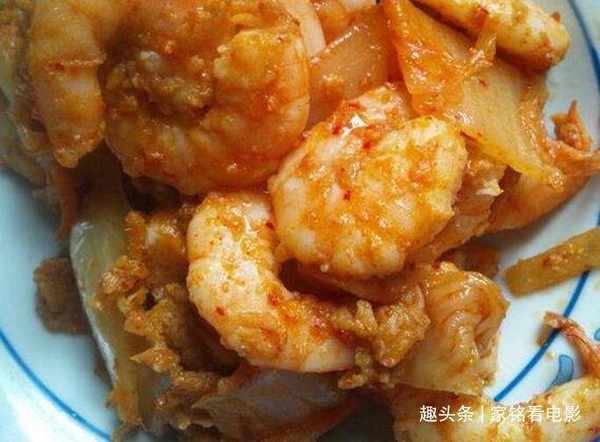 材料: 鲜虾、韩式辣白菜、盐、料酒、胡椒粉、蛋清、生粉;