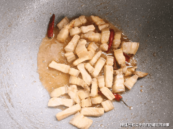 2、起锅烧油,放入五花肉块,小火煸炒出油,肉块颜色金黄后放入冰糖,小火炒出糖色,翻炒均匀给肉块上色,放入葱姜、八角、香叶、干辣椒炒出香味。