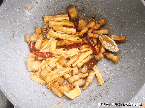 3、倒入泡发的腐竹,中火翻炒均匀,加入适量生抽、老抽调色,翻炒均匀后倒入开水没过食材,加适量盐,大火炖10分钟。