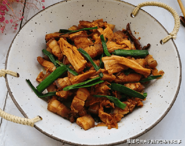 1、腐竹掰成小段,提前用水浸泡4个小时,泡软后洗干净,沥干水分。五花肉切块,青蒜苗洗净切段,生姜切片。